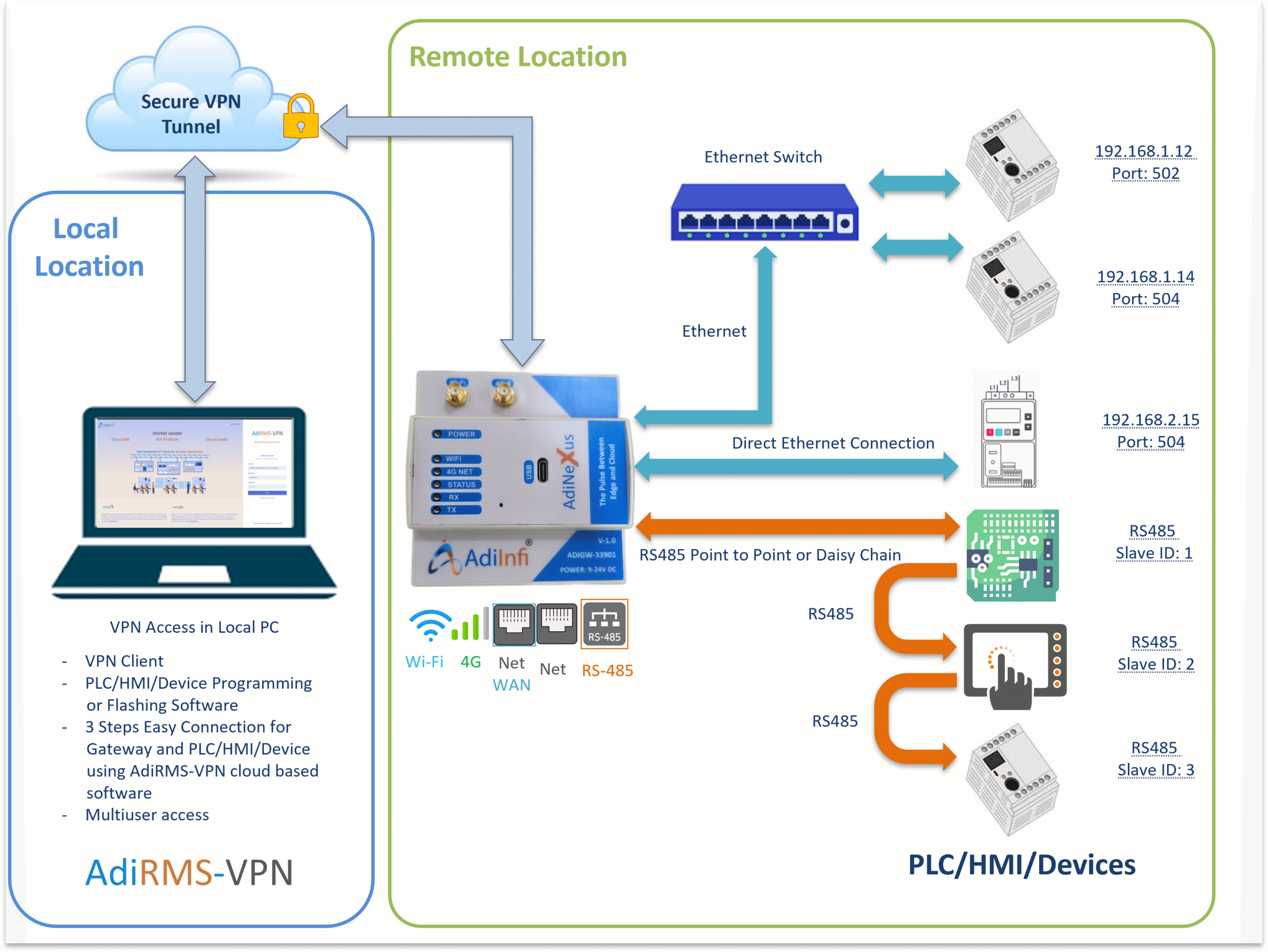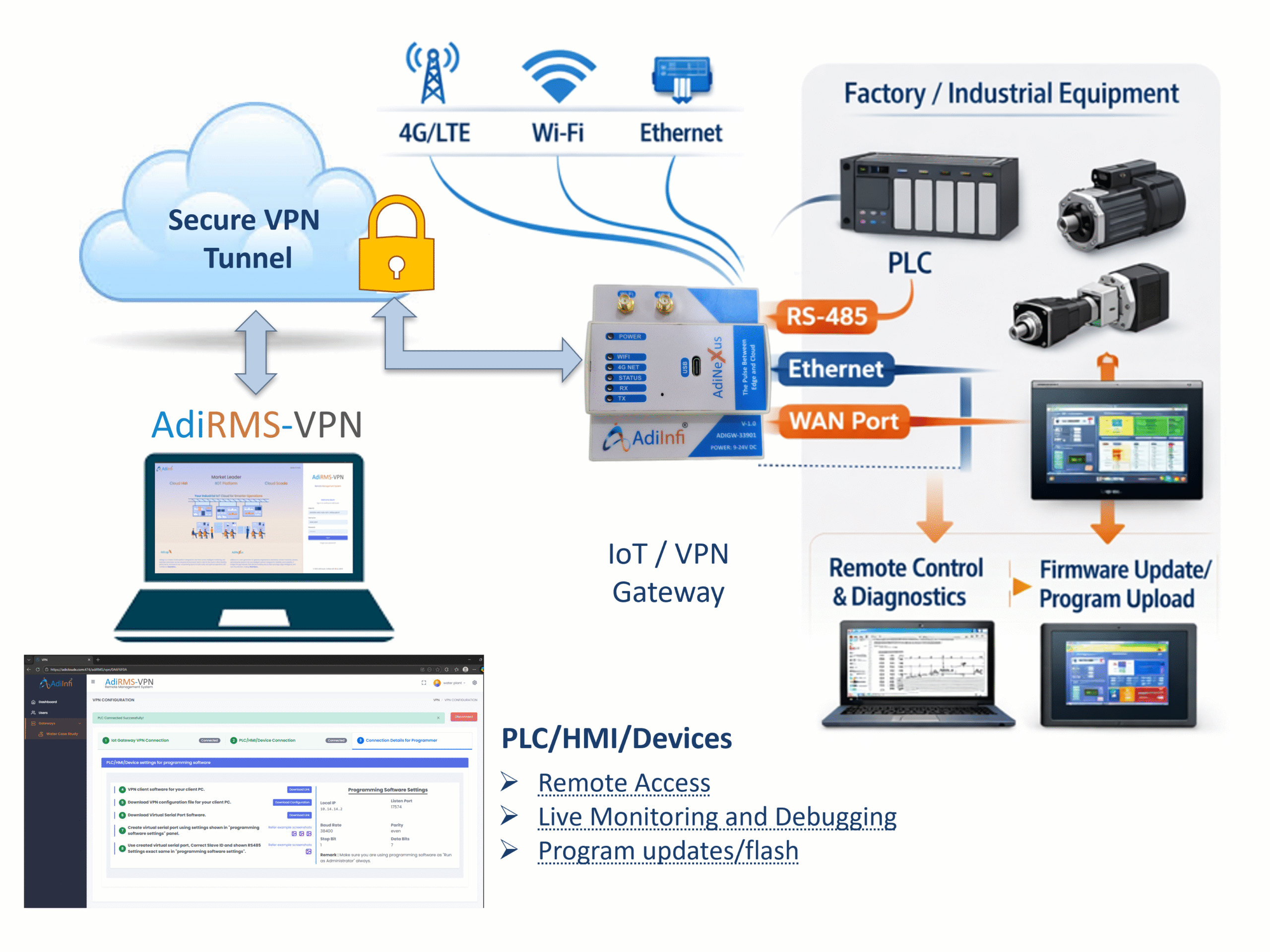 AdiRMS-VPN securely bridges remote field assets and enterprise systems, enabling faster troubleshooting, reduced downtime, and secure industrial remote access—empowering industries to operate efficiently and confidently.