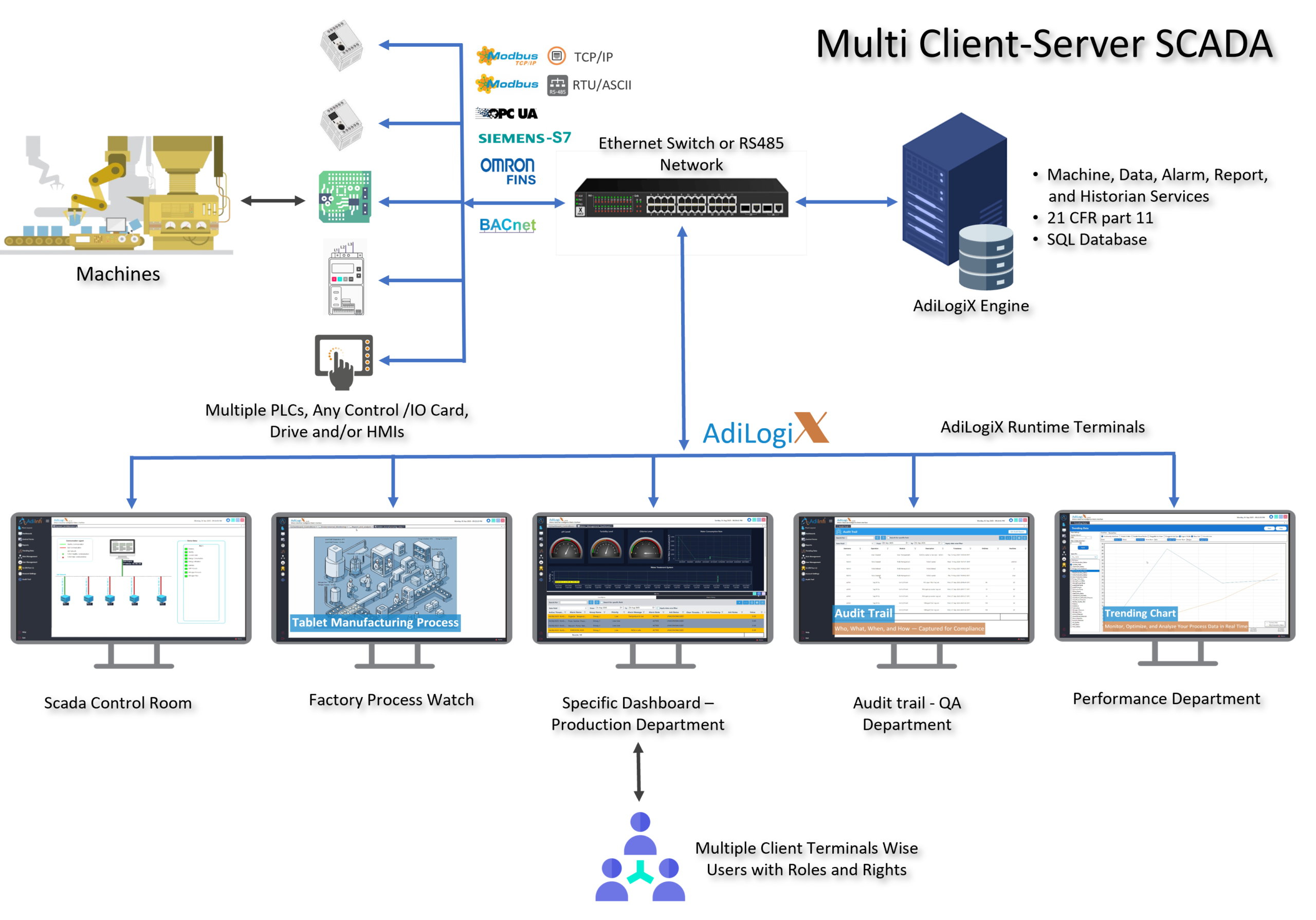 Adilogix is a next-generation SCADA platform built for real-time monitoring, control, and visualization of industrial processes. It supports industry-standard protocols including OPC UA, MQTT, BACnet, and multiple other industrial communication protocols, enabling seamless integration with diverse devices, systems, and automation environments while ensuring scalability, reliability, and operational efficiency.
