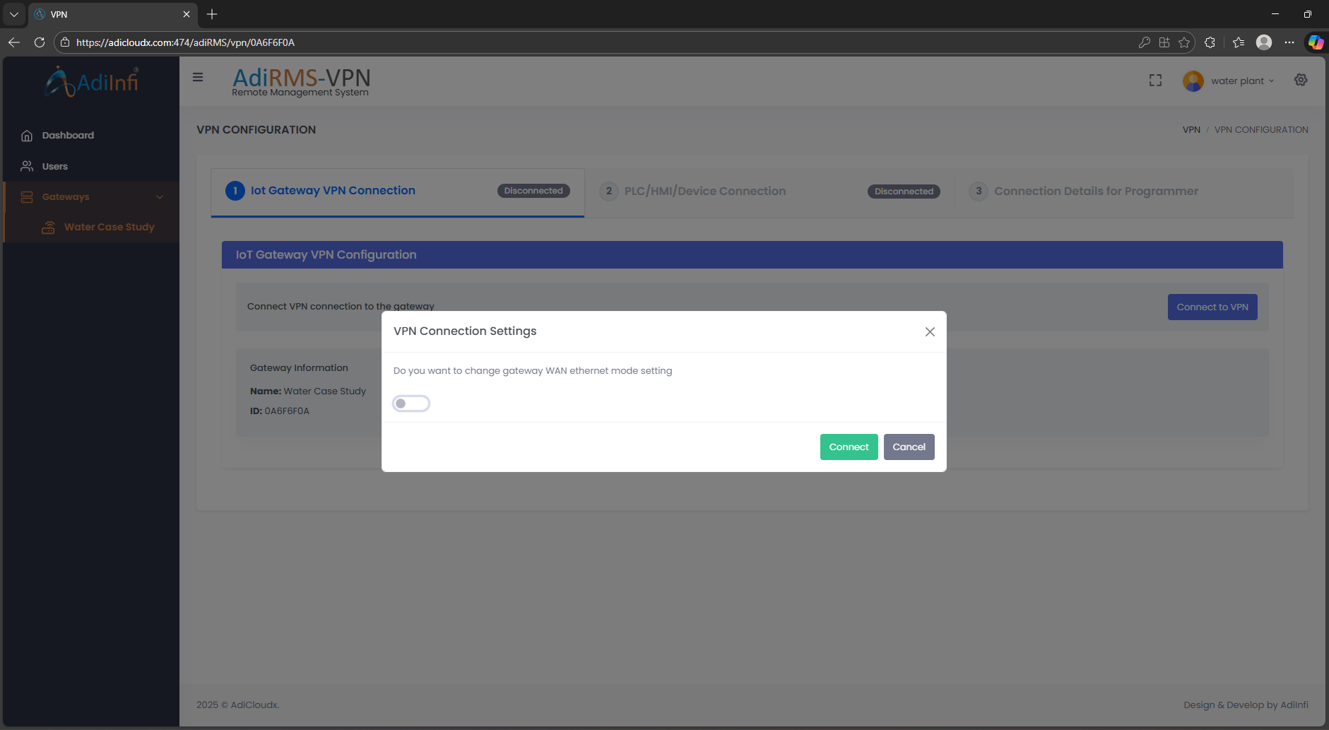 Secure Industrial Connectivity with AdiRMS-VPN enables safe remote access to RS485 devices, Ethernet-based equipment, and WAN networks. Using encrypted communication through the AdiNexus Gateway, it protects PLCs, HMIs, and industrial systems while allowing reliable monitoring, updates, and maintenance from anywhere. This ensures high security, reduced downtime, and seamless connectivity across industrial environments.