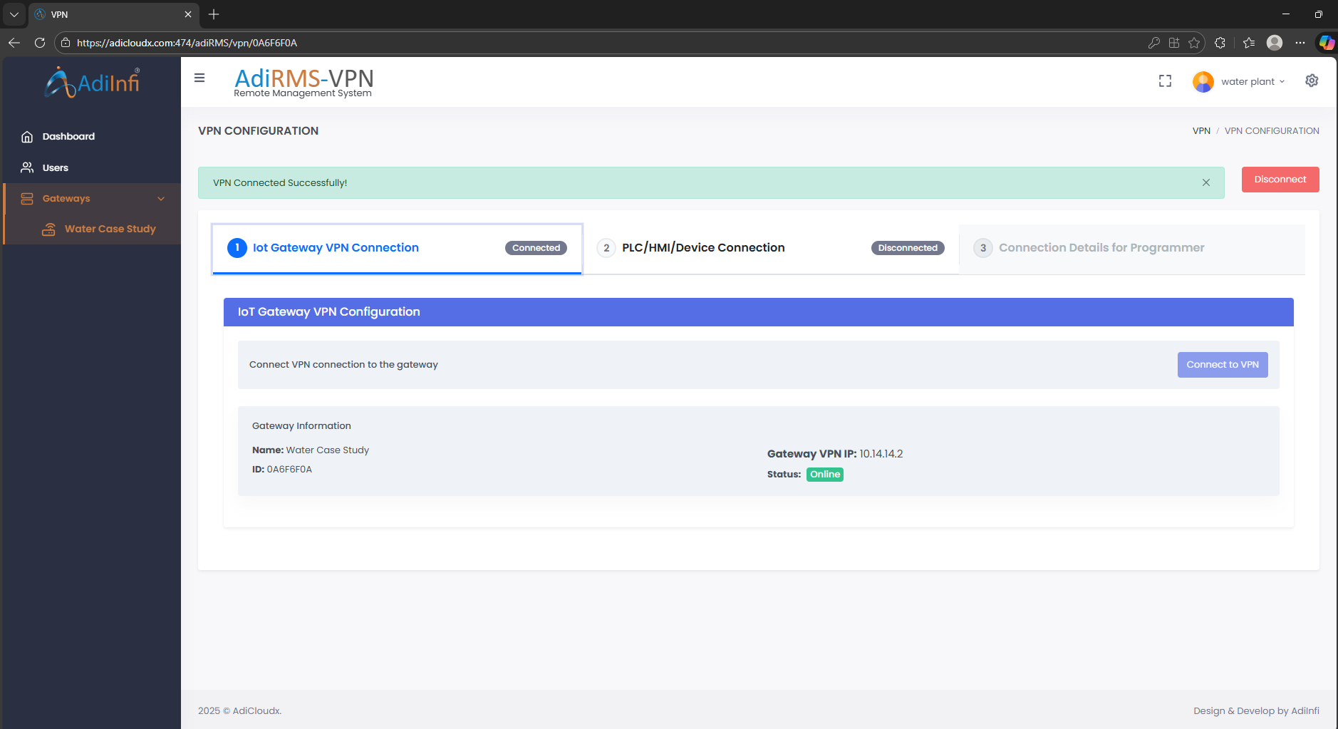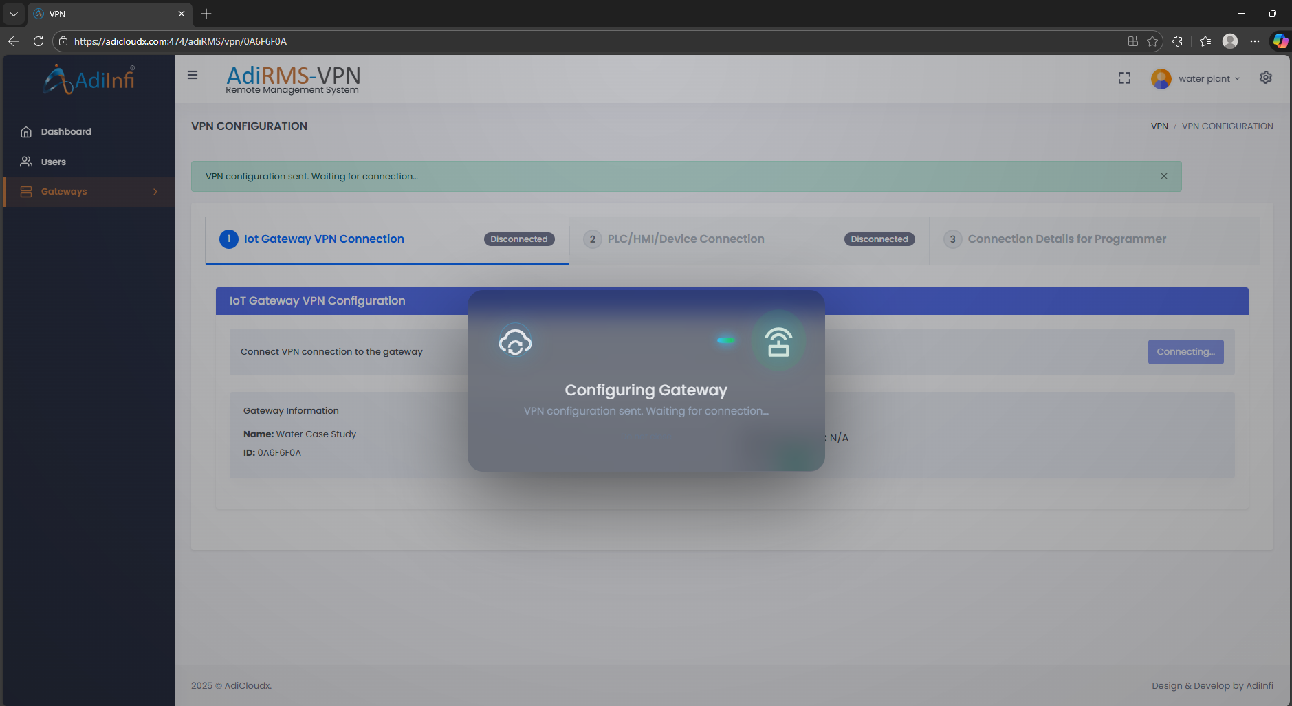 Remote Access Anytime, Anywhere with AdiRMS-VPN allows engineers to securely connect to PLCs, HMIs, and industrial devices from any location at any time. Through the AdiNexus Gateway, users can monitor systems, update programs, change parameters, and perform live debugging without onsite presence. This ensures faster response, reduced downtime, and complete control over industrial operations.