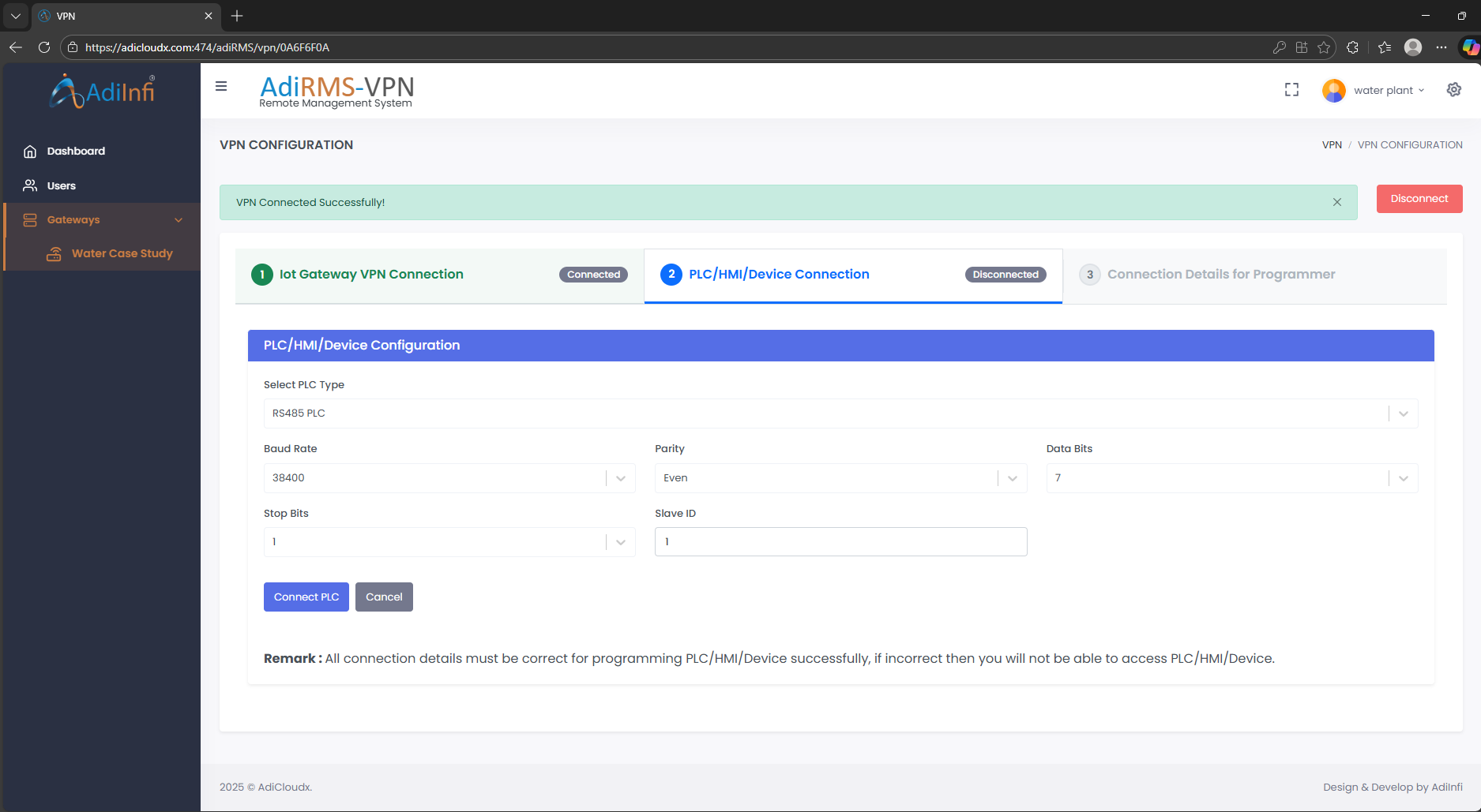 Connect to PLC over VPN. PLC can be connected to AdiNexus IoT Gateway over Ethernet or RS485.